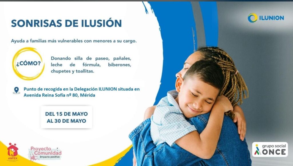 En ANFEX (Asociación de Niños Felices de Extremadura), nos llena de orgullo anunciar el lanzamiento del proyecto “Sonrisas de ilusión”, una iniciativa solidaria desarrollada en colaboración con ILUNION y el Grupo Social ONCE, con el objetivo de brindar apoyo a familias vulnerables con menores a su cargo.